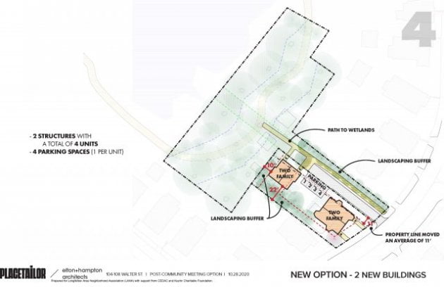 In November, the city received a $387,000 grant from the Commonwealth to help pay for the purchase of 104 and 108 Walter, which were offered for sale jointly. The Longfellow Area Neighborhood Association (LANA) received a planning grant and hired architectural firm PlaceTailor Design to work with neighbors during two October workshops. A preferred site plan was developed for affordable home ownership opportunities and open space conservation for climate resiliency. The resulting consensus proposal makes possible the preservation of 108 Walter Street, which is closest to the wetlands boundary and the most ecologically sensitive, and proposes four units of affordable ownership housing at 104 Walter, which has already been developed and now includes a single-family house and a dilapidated barn.